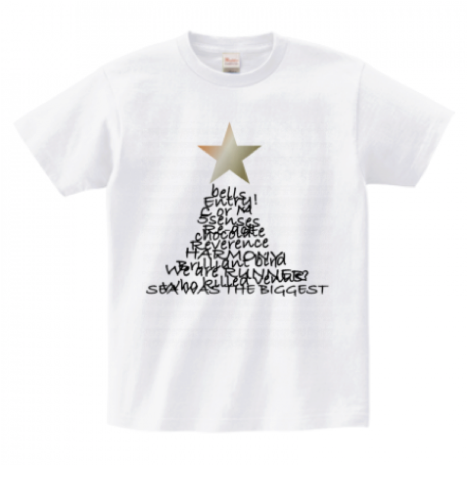 EIJI楽曲のタイトルで飾り付けされたツリーロゴをプリントしたTシャツ。